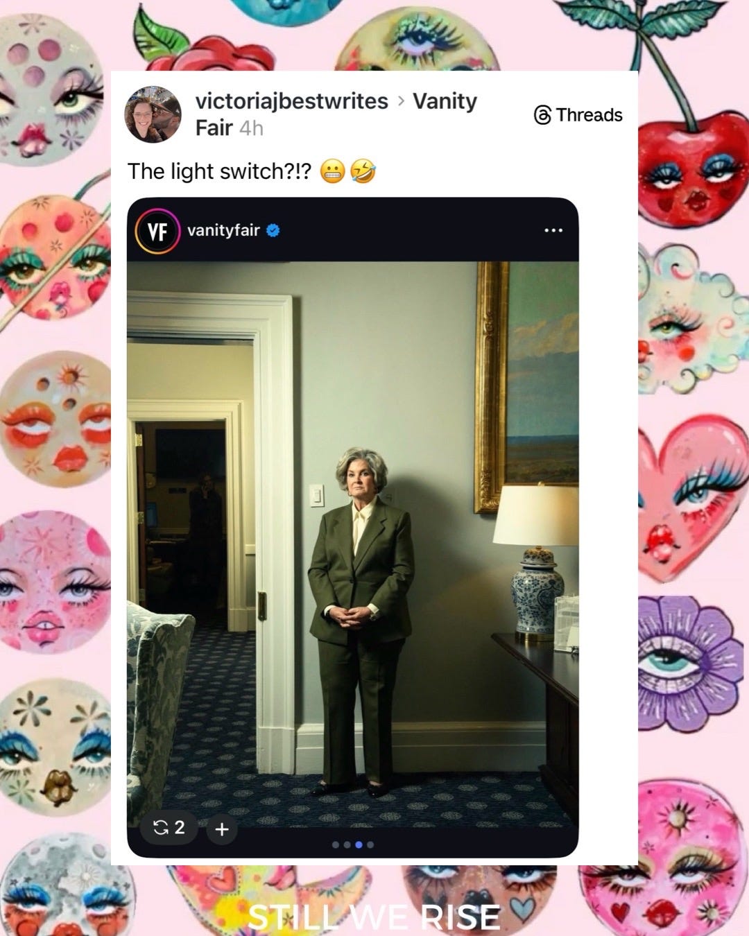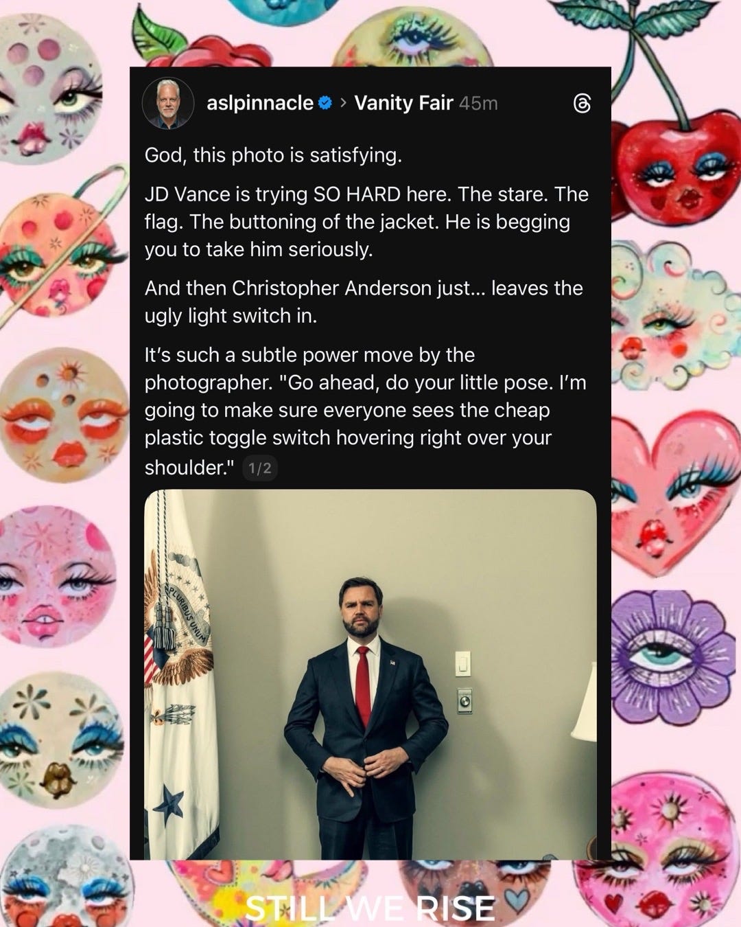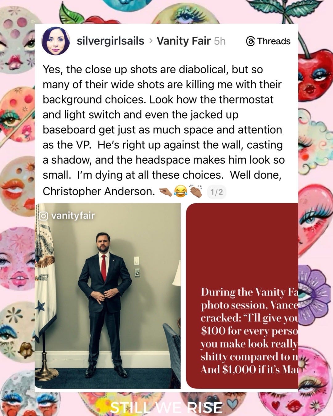 Playback speed×Share postShare post at current timeShare from 0:000:00/0:00Transcript3857The Vanity Fair Meme Roundup You’ve Been Waiting ForLindsay Meyer-HarleyDec 17, 20253857ShareTranscriptDiscussion about this videoCommentsRestacksStill We Rise by Lindsay Meyer-HarleySubscribeAuthorsLindsay Meyer-HarleyRecent PostsToday 11.12 in Pictures + PostsNov 13, 2025 • Lindsay Meyer-HarleyA Lesson on Fascism by Rick StevesMar 20, 2025 • Lindsay Meyer-Harley